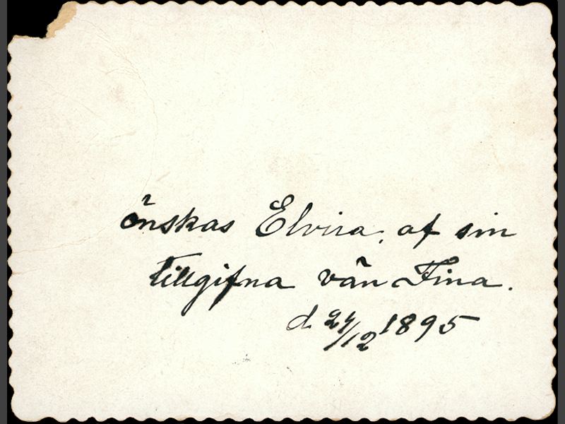 Kortets baksida: handskrift, bläck: "önskas Elvira af sin/ tillgifna vän Tina./ d. 24/12 1895".