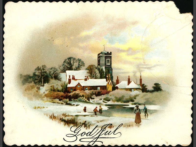 Kortets framsida: En borggård med borgen och tillhörande hus. Längst fram: ett sällskap bestående av en kvinna, en man och tre små barn vid frusna bäcken.