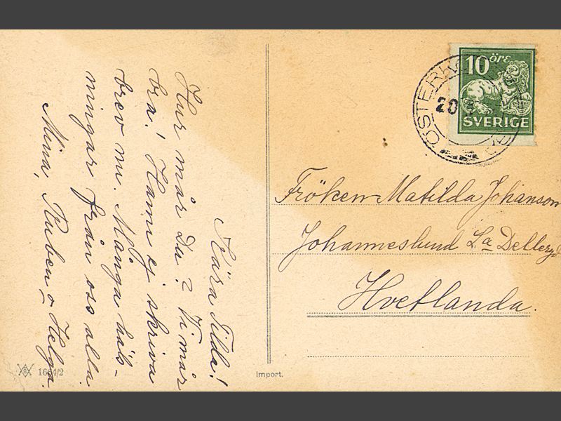 Kortet är adresserat, på baksidan, till "Fröken Matilda Johanson/ Johanneslund L:a Delleryd/ Hvetlanda".