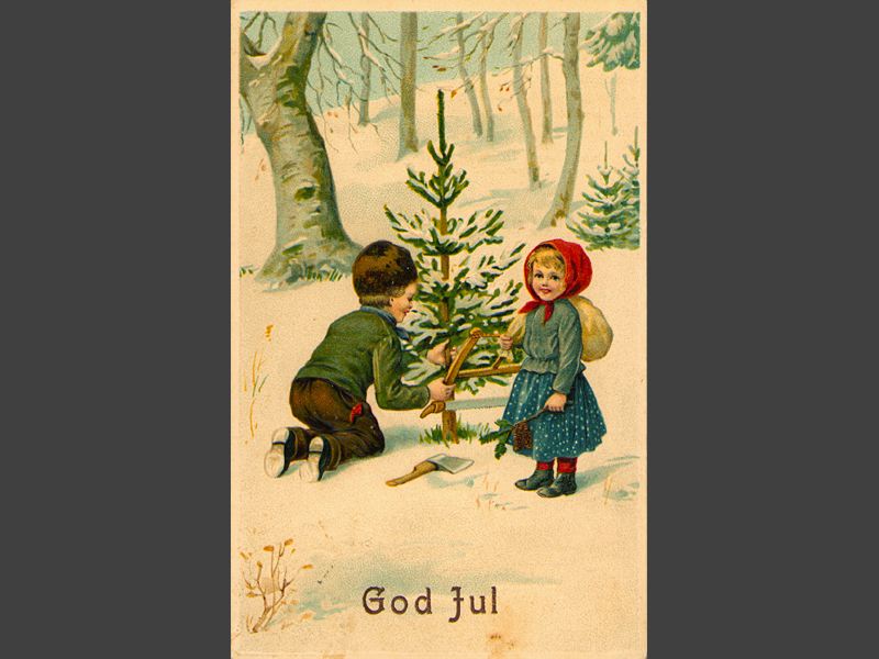 Kortets framsida: Ett litet sällskap, bestående av en pojke och en flicka, sågande en gran i en gles skog. Snölandskap. Längs nedre kanten, i mitten "God Jul" tryckt i brunt.