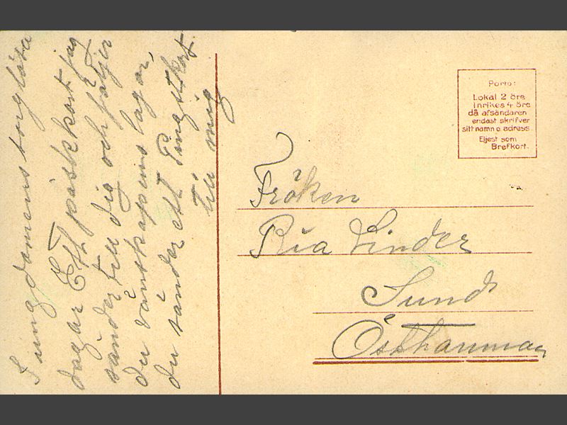 Kortets baksida: Tryckt, högra hörnet, uppe: "Porto: / Lokal 2 öre / Inrikes 4 öre / då afsändaren / endast skrifver / sitt namn o. adress / Eljest som / Brefkort". Handskrivet, blyerts: adresserat till " Fröken / Pia Linder / Sund/ Östhammar".