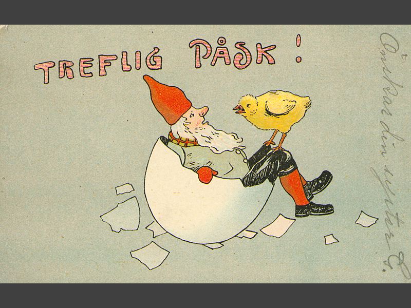 Kortets framsida föreställande en "nykläckt" tomtenisse sittande i ett äggskal, med en kyckling på sina knän. Ovanpå bilden tryckt i rött "Treflig Påsk!". Vid kortets högra sida, handskrivet, blyerts: "Önskar din syster G.".