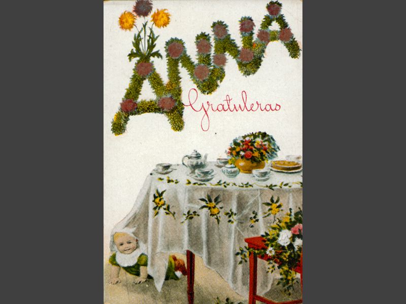 Gratulationskort. "Anna", namn i blommor, i övre delen av kortet, "Gratuleras", tryckt i handskrift, rött. I nedre delen av kortet ett festdukat bord, med kaffekoppar, en vas med blommor och en tårta. Under bordet, ett krypande barn. På en röd stol, vid sidan om bordet, en bukett olika blommor.