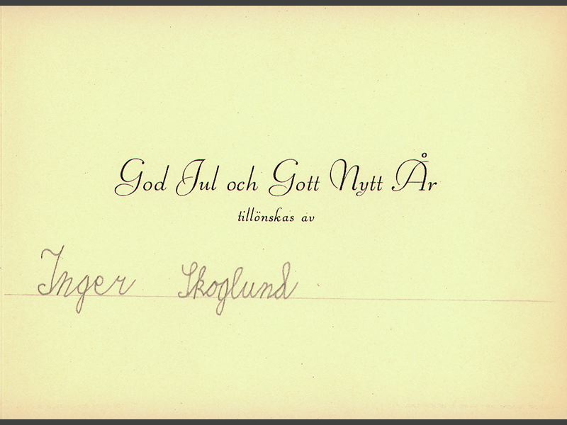 Kortets insida: "God Jul och Gott Nytt År/ tillönskas av", tryckt. Handskrivet, blyerts: "Inger Skoglund".
