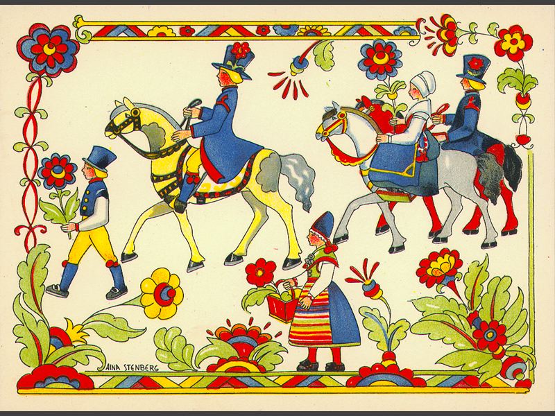Dubbelkort. På kortets framsida en procession, två herrar och en fru ridande hästar, en pojke och en flicka gående, bärande blommor, alla klädda i nationaldräkter. Allt är inramat i en blommig ram. "Aina Stenberg", tryckt i vänstra nedre hörnet.