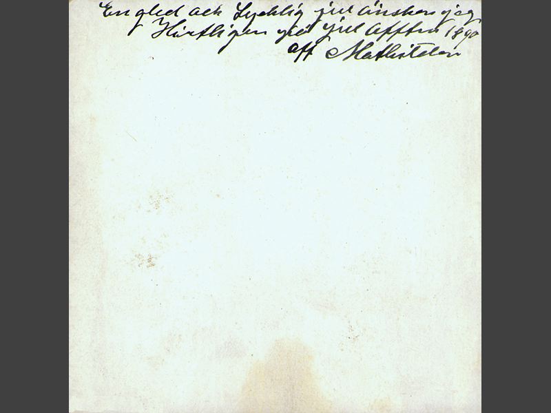Kortets baksida: Handskrivet, bläck: "En glad och Lycklig jul önskar jag/ Hirtligen på jul Affton 1890/ aff Mathilda" .