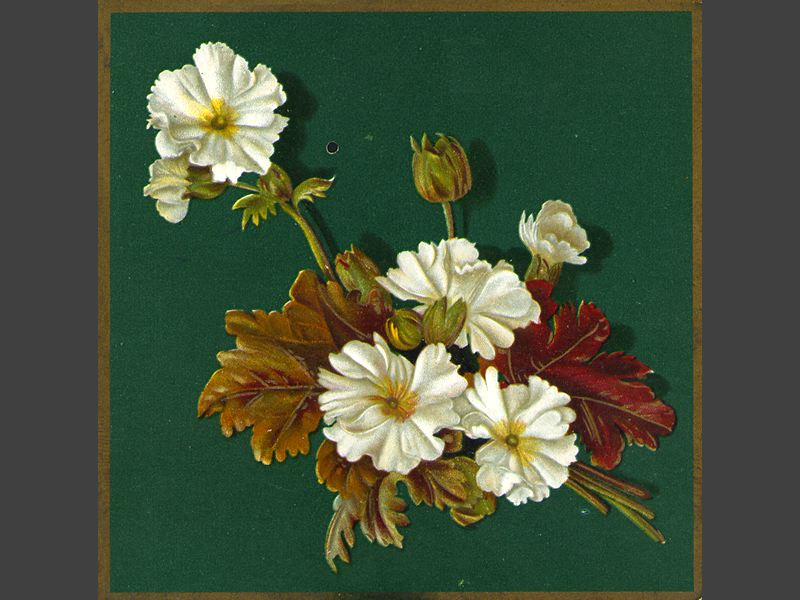 En liten bukett vita blommor med rödbrunaktiga löv på en grön bakgrund.