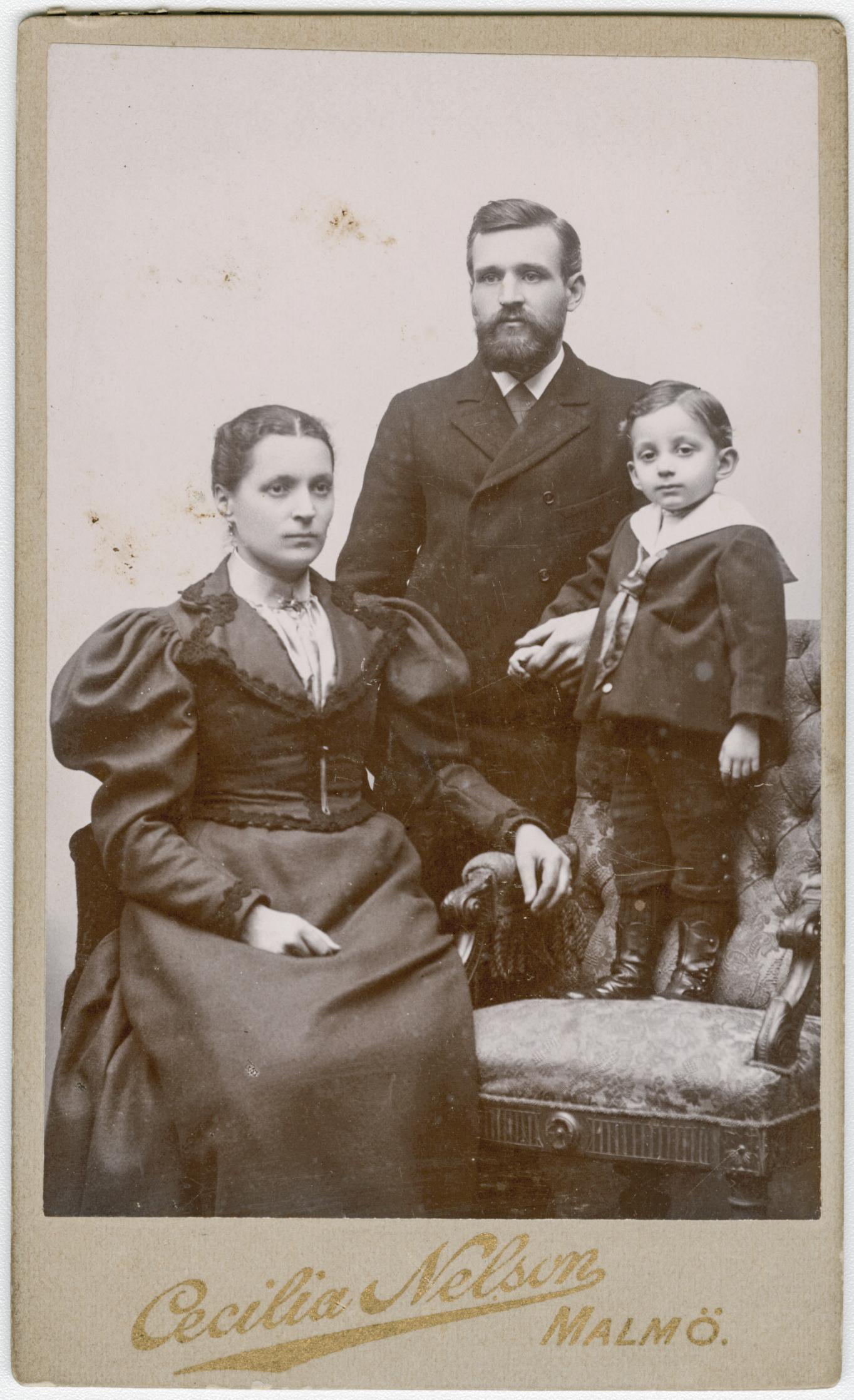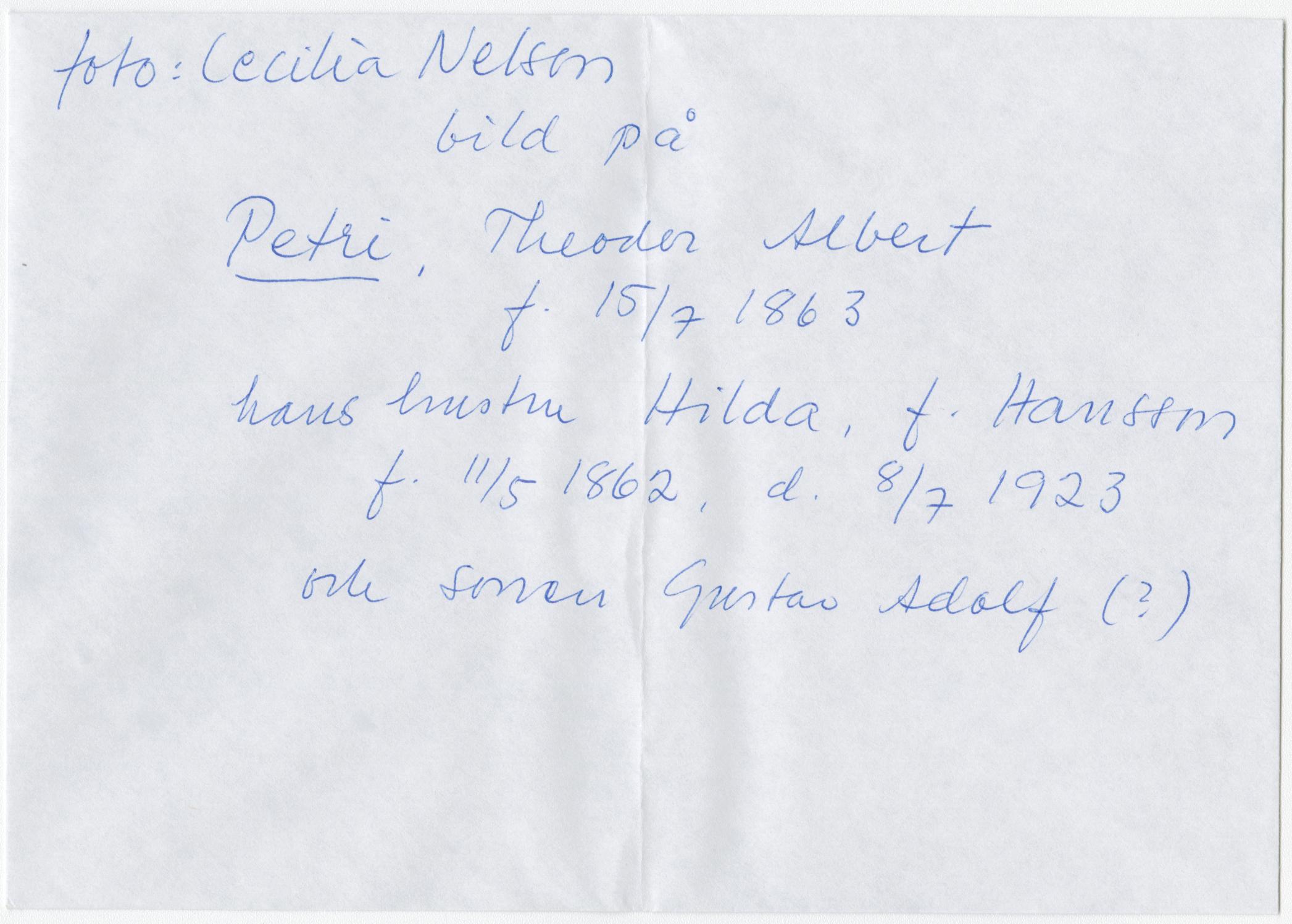 - Visitkortsfotografi. Porträtt av klädesvävaren Theodor Petri , dennes hustru Hilda och sonen Gustav Adolf. Foto ur album, har tillhört giverskans farmor Ida Augusta Nilsson [född Hansson] född i Malmö 1879 i S:t Petri församling och död 1937 i Västra Skrävlinge församling. Hennes syster Hilda var gift med Theodor Petri.