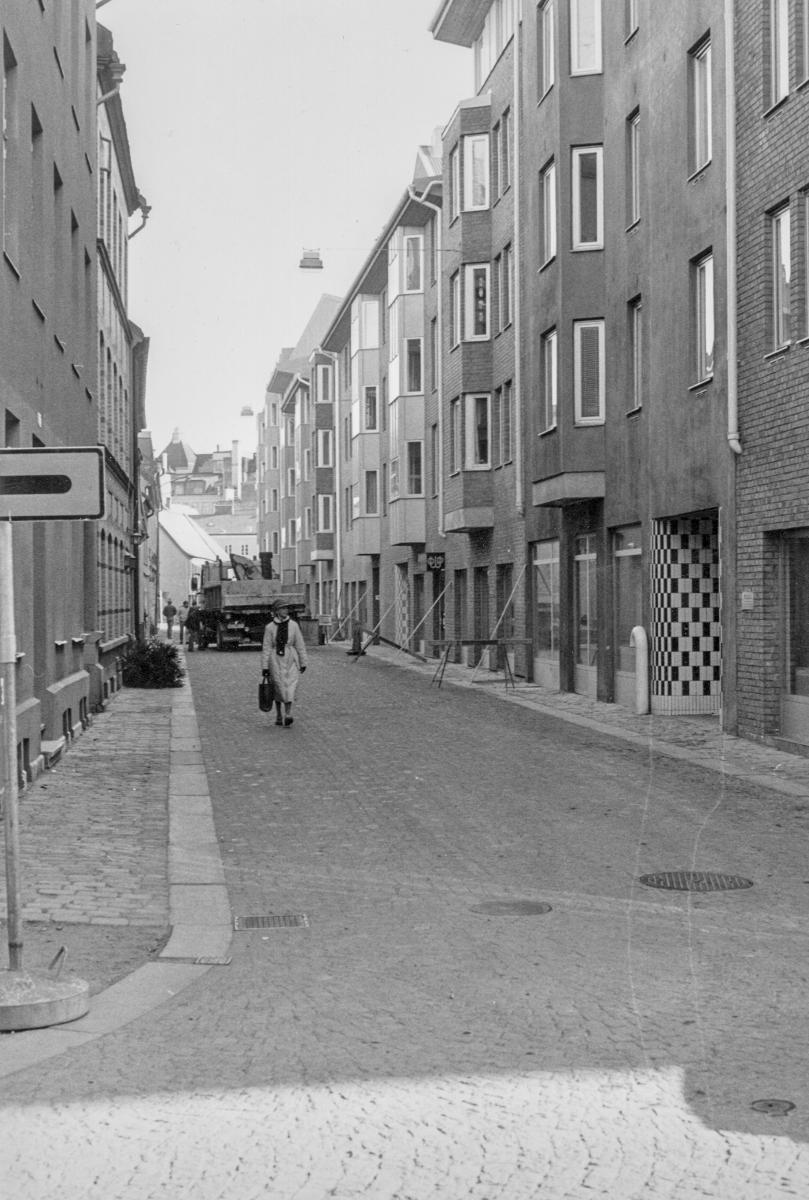 Gatubild - Tegelgårdsgatan österut. Till väster kvarteret Druvan och till höger kvarteret Tranan, som ser alldeles nybebyggt ut vilket det blev i början av 1980-talet.
