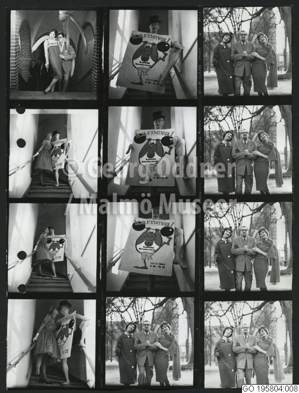 Karnevalsmode, med Sten Broman stående mellan modellerna. Och man med karnevalsskylt hängande runt halsen.