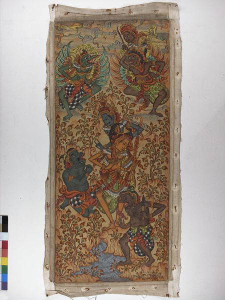 bakgrunden är täckt av bladslingor. Akvarell och limfärg på bomullsduk.
