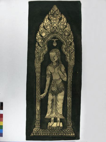 Tempeltryck av guldtryck på mossgrön botten av papper. Stående kvinnlig
