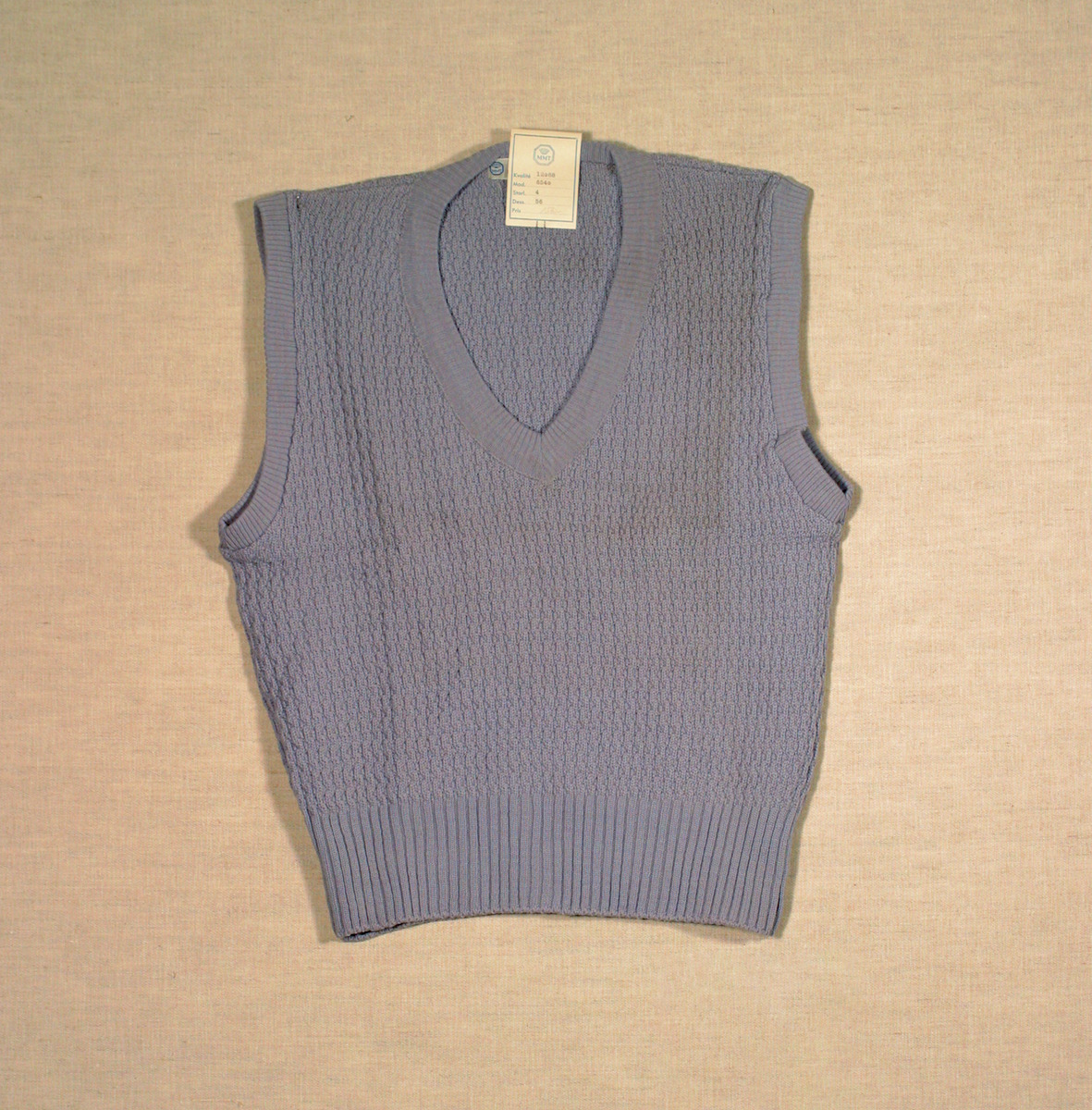 Slipover, maskinstickad av grått ullgarn. V-ringad. Bred resårstickning nedtill och smalare resår runt hals och ärmhål. Märkt bak med pappersetikett.
