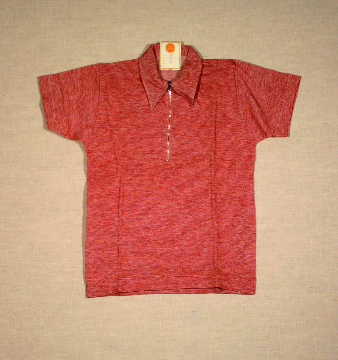Jumper av vinröd ull (?) med kort ärm och liggande krage med spetsig snibb. Knäppning fram med 19 cm långt blixtlås.