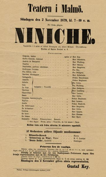 Teateraffisch. Föreställning på Malmö Teater söndagen den 2 november 1879. Det Keyska Skådespelarsällskapet ger vaudevillen Niniche med bl.a. makarna Key och Ludvig Otterström på rollistan.