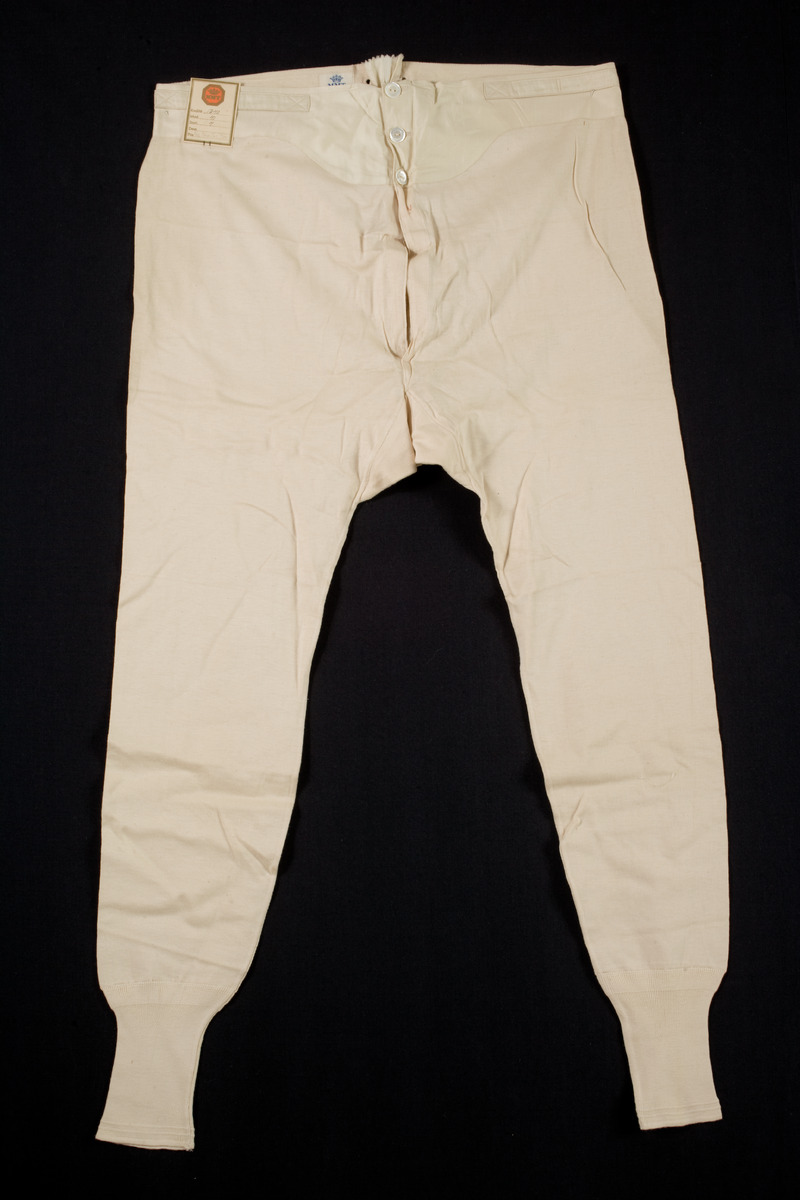 Långa kalsonger med knäppning fram med tre knappar, gylf. Sprund bak med knytband. Påsydd fodring i tyg utvändigt i midjan. Stickad resår i bensluten.