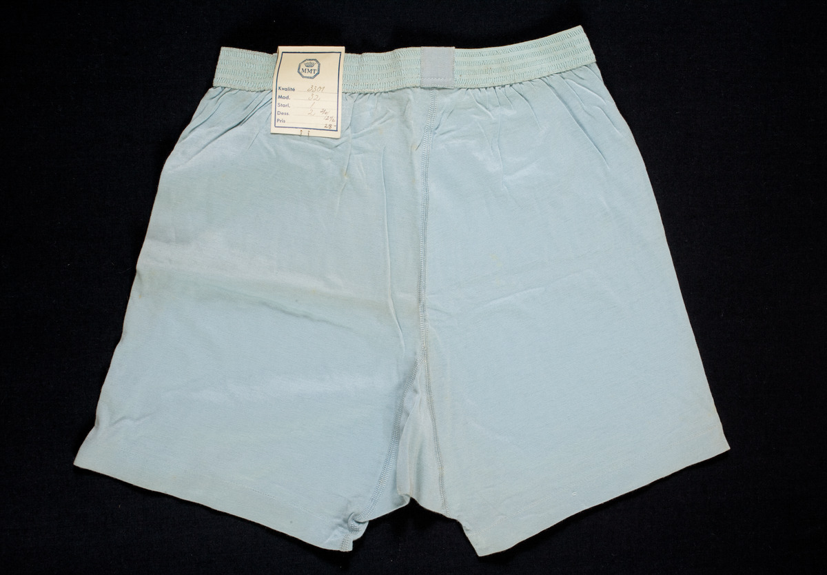 Kalsonger med korta ben, midjeresår och gylf. pappersetikett med blå MMT logotyp. Pris 2- 21/2 / 28:-