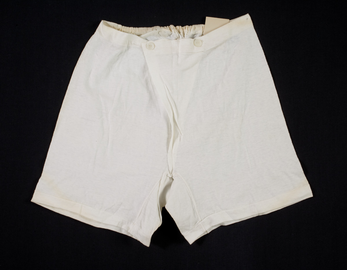 Kalsonger med korta ben och knäppning fram i omlott med två knappar, gylf. Midjeresår bak.