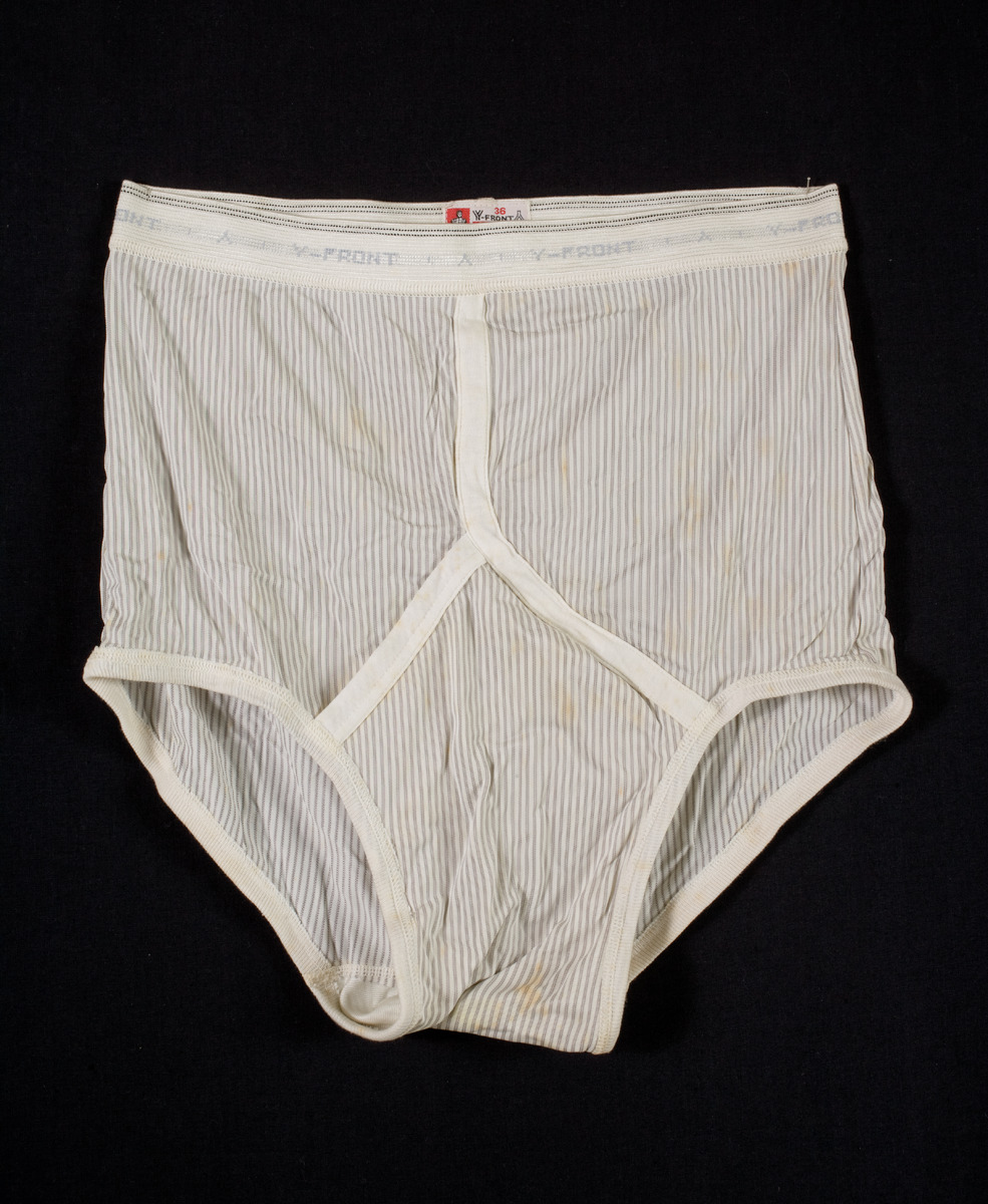 Kalsonger utan ben och med Y-front skärning fram, gylf. Påsydd resår i midjan med text invävd: Y-FRONT Vit/grå randiga.