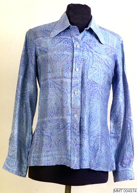 - Skjortblus av tunnt siden, turkosblå och mönstrad med blomstermotiv i vitt. Liggande krage med rundade snibbar. Lång ärm med manschett med sprund och knäppning med en knapp. Framtill knäppt med 6 knappar. Lätt figursydd.
