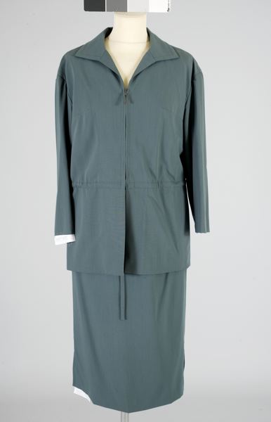 Jacka, rakskuren med lång ärm. Påsydd krage. Blixtlås fram till midjan. I midjan dragsko med knytband. Ljusgrönt fodersiden.