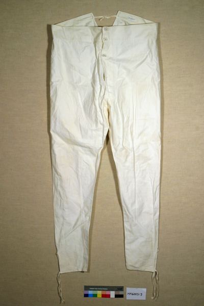 - Kalsonger sydda av kraftigt bomullstyg. Påsydd linning. Gylf med knäppning för 4 linneknappar. Sprund med knytband bak. Sprund med knytband nedtill i benen. Förstärkningar och lagningar i grenen.