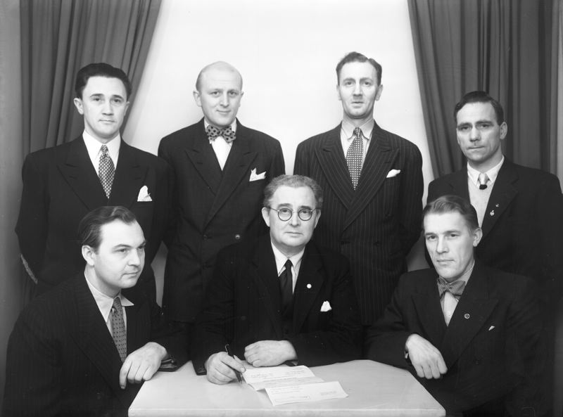 Grupp av män vid skrivbord - Tapetserare och sadelmakares styrelsemöte.