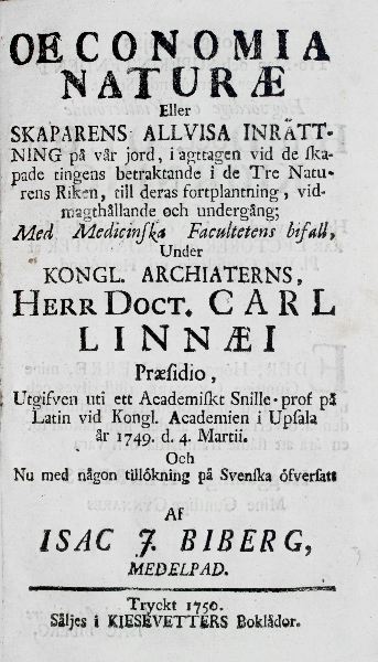 OECONOMIA NATURAE Eller SKAPARENS ALLVISA INRÄTTNING på vår jord, i agttagen vid skapade tingens betraktande i de Tre Naturens Riken, till deras fortplantning, vidmagthållande och undergång; Med Medicinska Facultetens bifall, Under KONGL. ARCHIATERNS, HERR DOCT. CARL LINNAEI Praesidio, Ugifven uti ett Academiskt Snille. prof på Latin vid Kongl. Academien i Upsala år 1749.d.d. Martii. Och Nu med någon tillökning på Svenska öfversatt av ISAC J.BIBERG, MEDELPAD.