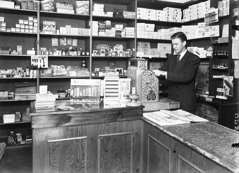 Affärsinteriör (hygienartiklar), man vid kassaapparaten.