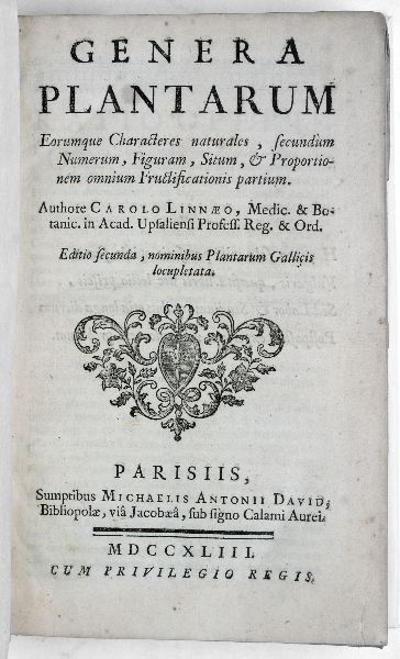GENERA PLANTARUM Eorumque Charcteres naturales, secundum Numerum, Figuram, Situm, & Proportionem omnium Fructificationis partium. Authore CAROLO LINNEAO, Medic. & Botanic. in Acad. Upsaliensi Profess. Reg. & Ord. Editio secunda, nominibus Plantarum Gallicis locupletatai. PARISIIS, Sumptibus MICHAELIS ANTONII DAVID, Bibliopolae, via Jacoaea, sub signo Calami Aurei. MDCCXLIII. CUM PRIVILEGIO REGIS.