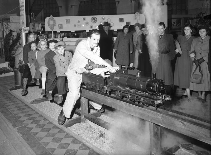 Funktionellt modelltåg på Hobbyutställningen i Södra saluhallen, Föreningsgatan. Lokförare och barnpassagerare.