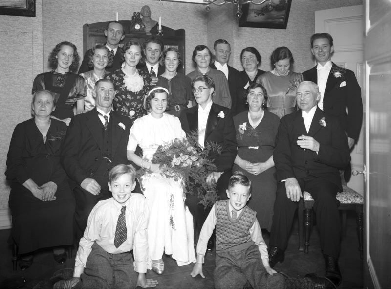 Gruppbild med brudpar.