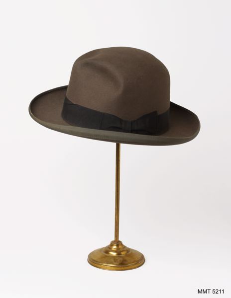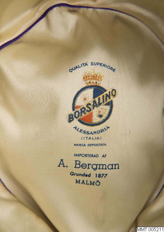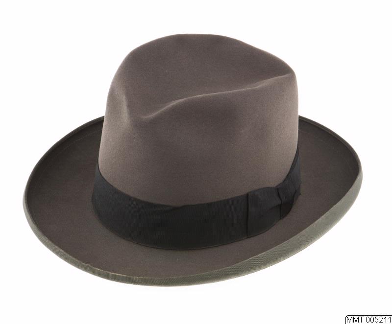 Herrhatt/ borsalino av grå filt. Mjuk kulle med lagt veck och uppåtvänd kant på brättet. Brett hattband med rosett på vänster sida av svart ripsband. Kantskoning på brättet av grått ripsband. Foder av vitt atlassiden. Svettrem av gråfärgat läder.
