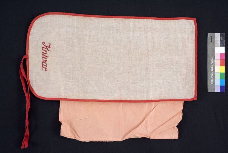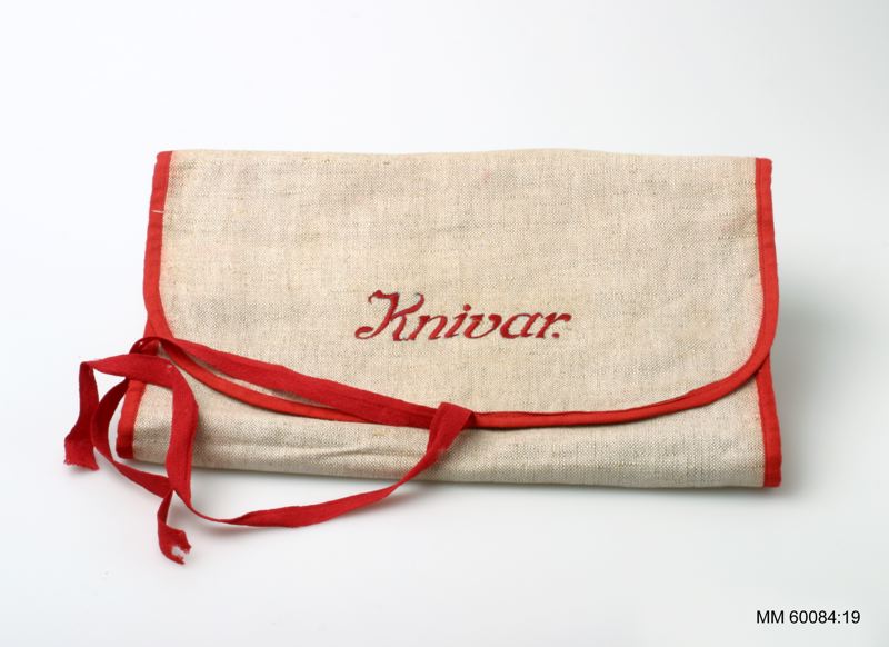 - Fodral för knivar i oblekt halvlinne med insida av ljust orange flanell. I ena korstsidan påsydd kanal med fack för ett dussin knivar. Utmed andra långsidan påsytt flanelltyg som viks in över mitten. Fodralet är rundat i ena korstsidan. Framsida av oblekt linne, på den rundade sidan finns ett broderi i rött bomullsgarn "Knivar", efter förtryckt mönster. Fodralet har en kantning av rött bomullsband, samt knytband av rött ylle.