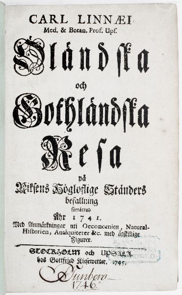 CARL LINNAEI Med. & Botan. Prof. Ups. ÖLÄNDSKA OCH GOTHLÄNDSKA RESA på Riksens högloflige Ständers befallning förrättad Åhr 1741. Med Anmärkningar uti Oeconomien, Natural-Historien, Antiquiteter & C. Med åtskillige Figurer. STOCKHOLM OCH UPSALA hos Gottfried Kiesewetter. 1745.
