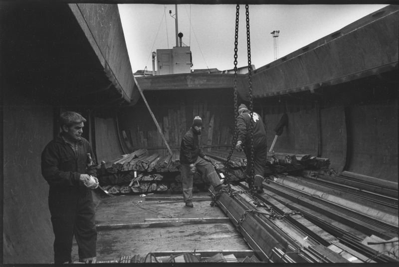 Sven Nilsson, Lars-Åke Andersson och Eddie Pråmberg lossar järnbalkar på båten Artemis.