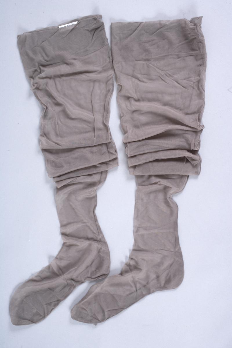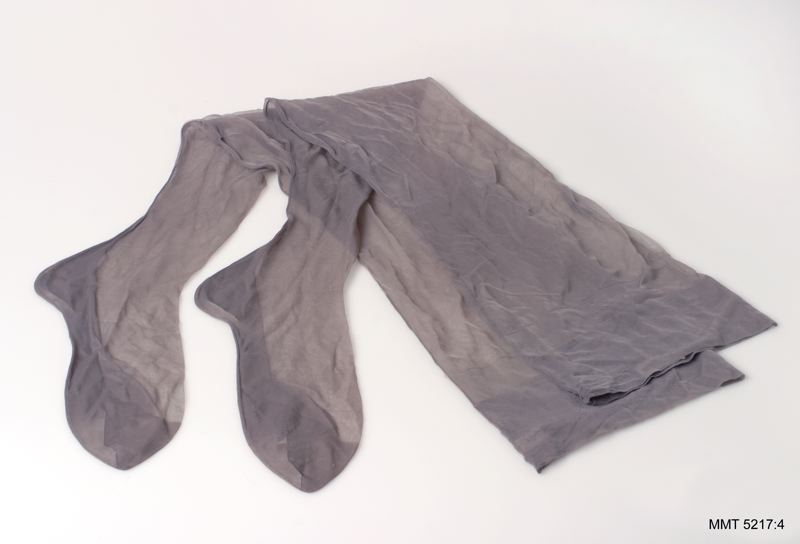 Ett par tunna, grå damstrumpor med söm bak. Förstärkt fotparti, dubbel, 7,5 cm bred krage med picotkant.