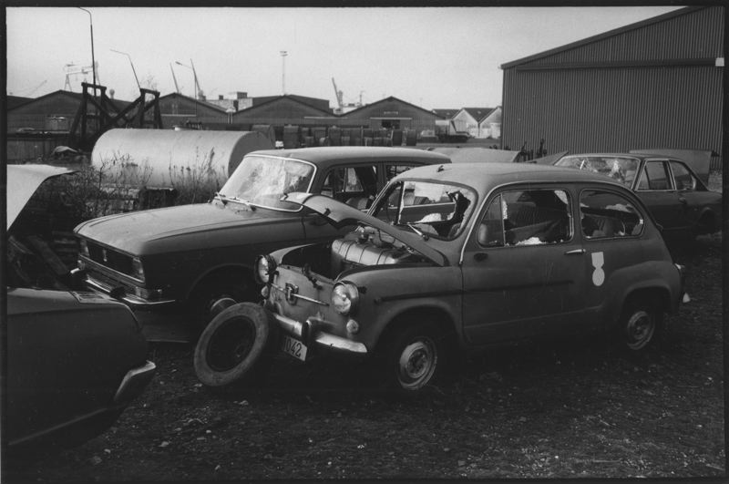 Intill M-10:an står gamla dekommisserade bilar, pallar, m.m.