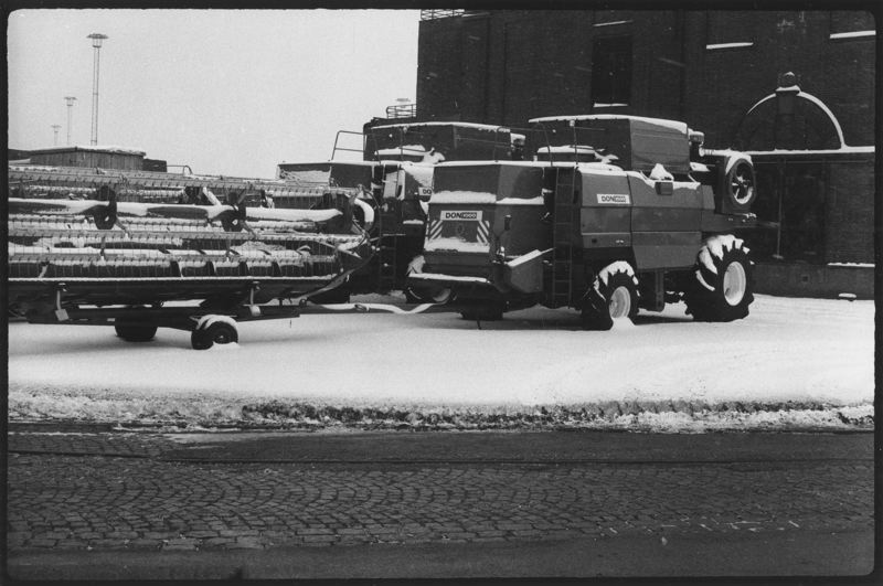 Ryska skördetröskor intill magasinet M-1:an. De stod länge där och sedan lastades de tillbaka på båten. "Det sägs att de lämnades tillbaka till leverantören."