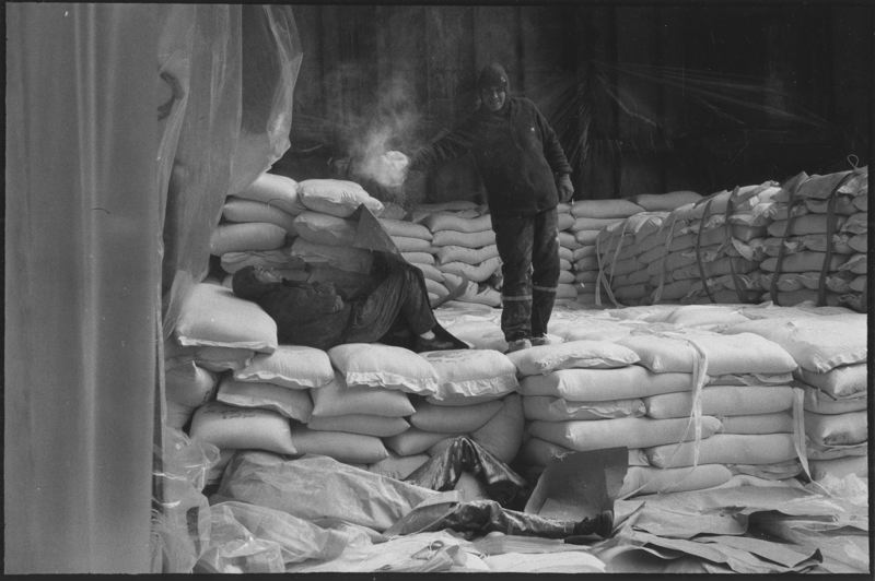 Lastning av vetemjöl på båten Tamer Kiran. Joaquín Romero kastar en näve vetemjöl på sin vilande kamrat.