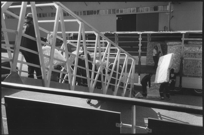 - Flyktingspråmen från Tyskland, som i vanliga fall används till idrottsdelegationer och olika sorters arrangemang. I väntan på flyktingarna bärs ombord nya nattbord, sängar och madrasser på båten Bibby Progress.