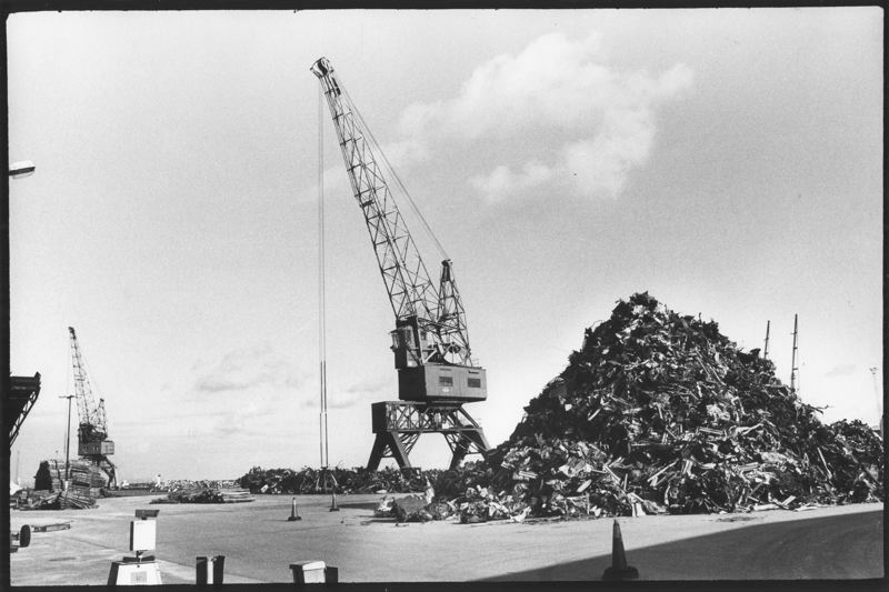 På kajen vid M-16 ligger skrot, stockar, stenar, s.k. icke-traditionellt gods.