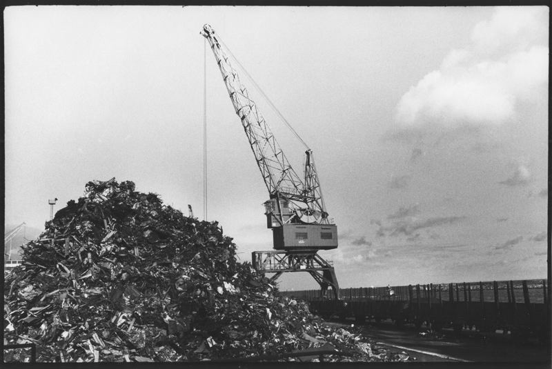 På kajen vid M-16 ligger skrot, stockar, stenar, s.k. icke-traditionellt gods. Skrotet kommer på vagnar till kajen.