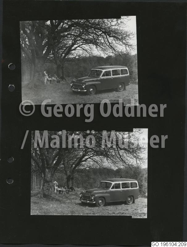 Picknick vid en bil (Volvo P210 Duett). Två kontaktkartor med samma nr.