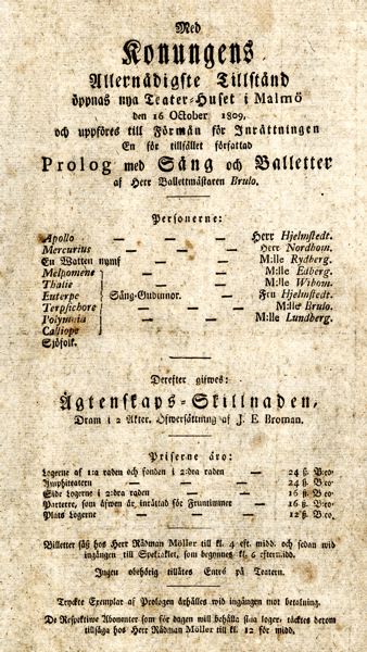 Teateraffisch. Föreställning den 16 oktober 1809 vid öppnandet av nya Malmö Teater vid Gustav Adolfs Torg till förmån för inrättningen. Svenska Komiska Teatertruppen under Brulo och Ambrosiani ger en för tillfället författad Prolog med Sång och Balletter af herr Ballettmästaren Brulo samt dramat Ägtenskabs-Skillnaden.