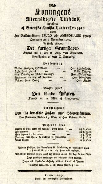 Teateraffisch. Föreställning vid Malmö Teater onsdagen den 6 december 1809. Svenska Komiska Teatertruppen under Brulo och Ambrosiani ger komedin Det farliga Grannskapet av August von Kotzebue, komedin Den blinde Älskaren och pantomimbaletten Den illa bewakade Flickan med koreografi av Brulo.