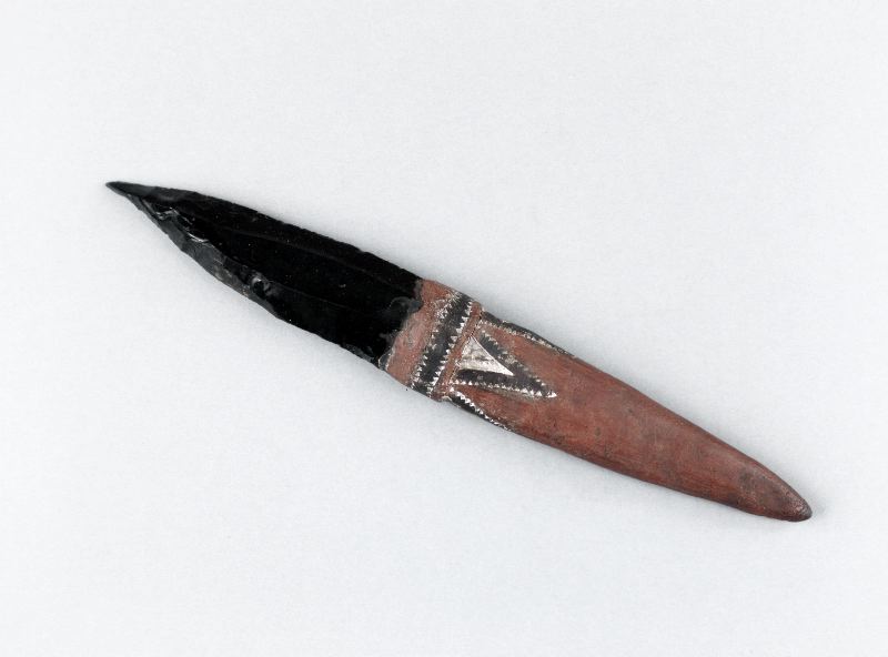 Ett kraftigt obsidianspån infattat i en trähylsa till ca 1/3 del av