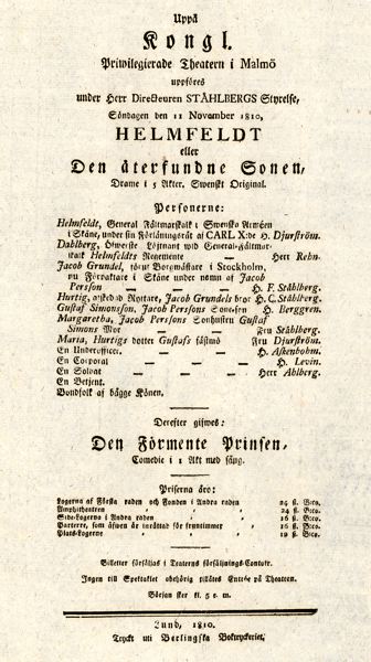 Teateraffisch. Föreställning vid Malmö Teater söndagen den 11 november 1810. Det Ståhlbergska Teatersällskapet ger dramat Helmfeldt av kung Gustav III och komedin Den Förmente Prinsen.