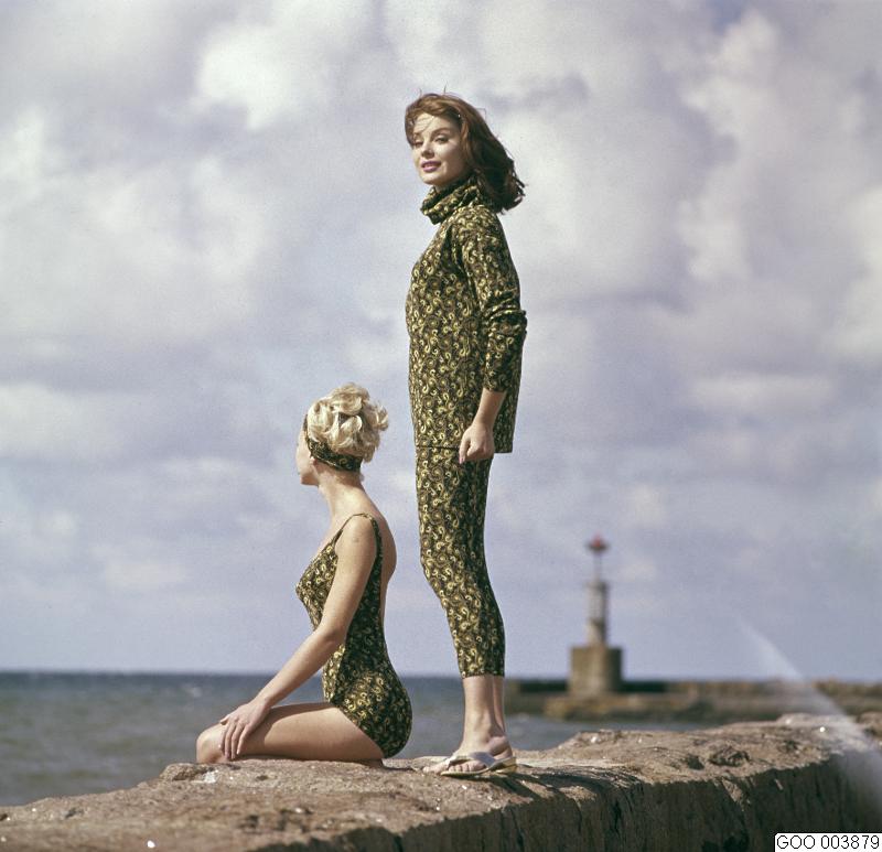 LAVINIA. Modeller klädda i mönstrad polotröja och tights samt baddräkt i brunt, mörk khaki och gult. Modebild såld via bildbyrån "Tio fotografer".