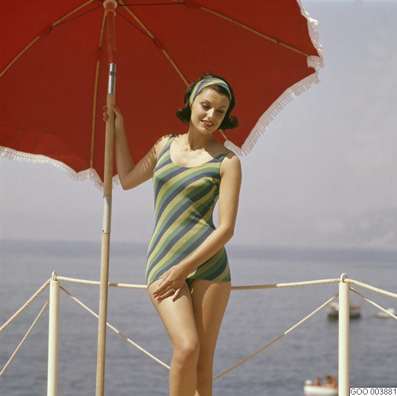 LAVINIA. Modell klädd i baddräkt med diagonala ränder i grönt, blått och gult, hårband i samma tyg. Modebild såld via bildbyrån "Tio fotografer".